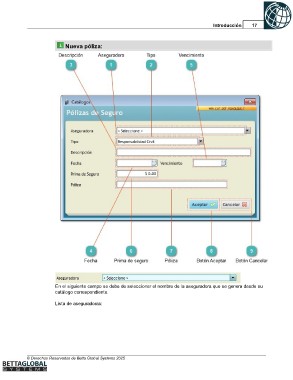 Introducción 17 Nueva póliza: En el siguiente campo se debe de seleccionar el nombre de la aseguradora que se genera desde su catálogo correspondiente. Lista de aseguradoras: © Derechos Reservados de Betta Global Systems 2025