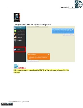 Introduction 13 Then you must Exit the system configurator. GRADES: It is necessary to comply with 100% of the steps explained in this manual. © Copyright of Betta Global Systems 2023