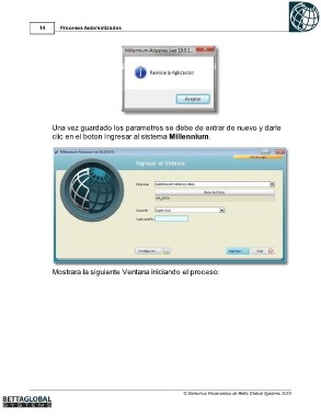 14 Procesos Automatizados Una vez guardado los parametros se debe de entrar de nuevo y darle clic en el boton Ingresar al sistema Millennium. Mostrara la siguiente Ventana iniciando el proceso: © Derechos Reservados de Betta Global Systems 2023